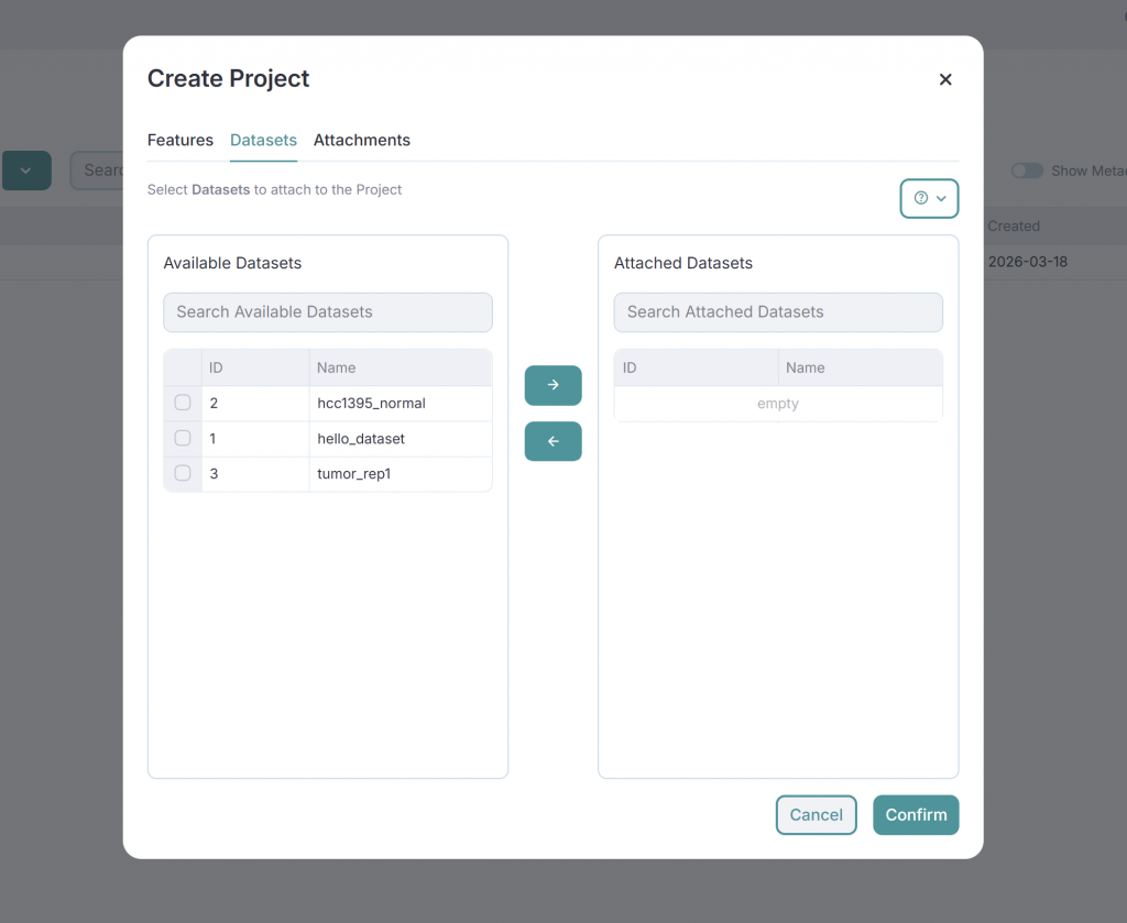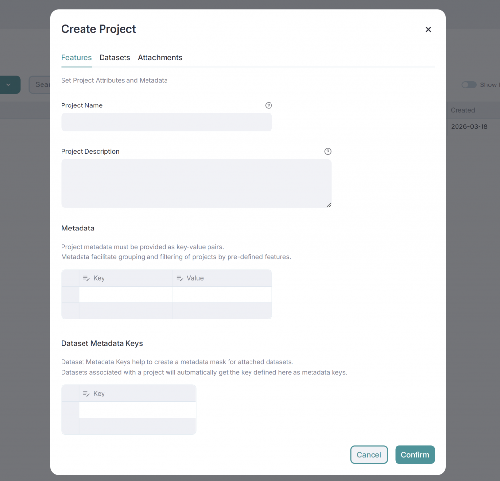 - Projects: These help organize multiple datasets for better management. Like datasets, projects can store Metadata and Attachments. Additionally, projects allow you to set Dataset Keys, which serve as metadata templates that are inherited by all datasets within the project. This ensures consistency in metadata structure across datasets. Each dataset can be assigned to multiple projects.