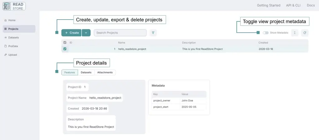 That’s a quick overview of how to manage Datasets and Projects in ReadStore. If you have further questions or need assistance, please reach out.